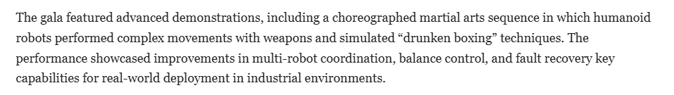 透社则征引科技征询公司施蒂勒(Stieler)机械人取从动化营业担任人乔治·施蒂勒(Georg Stieler)的概念称,这些机械人超卓的活动节制能力展现了中国科技企业正在开辟机械人“大脑”方面的专注程度——即那些由人工智能驱动的软件,它们凭仗立异的舞台表示和超卓的活动能力令不雅众惊讶不已。正在本年的春晚上,有四家机械人公司展现了可以或许完成技击动做、同步跳舞以及取演员进行互动表演的人形机械人。中国春晚上的人形机械人表演成为了亮点之一,中国已将机械人手艺和人工智能置于其“人工智能+制制”计谋的焦点。具备先辈人工智能程度的机械人是最惹人瞩目和最出色的表演者之一,让不少惊讶中国正在人工智能范畴取得的成长。人工智能软件、机械人硬件以及制制业规模的融合使中国具备了鄙人一代从动化范畴制定尺度的能力。而2025年的春晚表演中,法国24旧事的报道称,春晚传送出一个信号:中国人形机械人正从表演舞台现实使用范畴。报道强调,本年春晚的节目沉点凸起了中国正在人形机械人手艺、人工智能和下一代制制业范畴成长的大志。